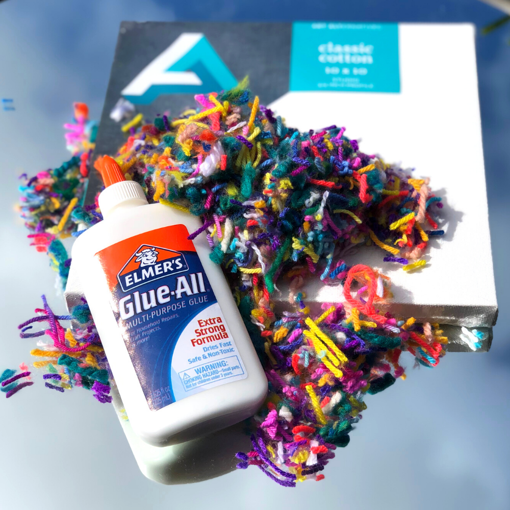 Add a thick layer of fluff and glue mix until the parts of the canvas that were exposed are covered. (Avoid the taped areas if you can.) We like to drizzle any extra glue mixture over the fiber pieces as much as possible at the end, too. This will help the yarn stay attached the the canvas.